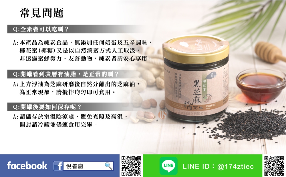 嚴選頂級原粒黑芝麻與與台農九號焙炒花生,經中度焙炒,使用日本極細磨醬設備研磨,呈現獨有的絹絲滑順口感,極細緻微粒的質地令人驚艷,再與椰花蜜及果寡糖充分調和,微甜不膩口,是讓人愛上的滋味。